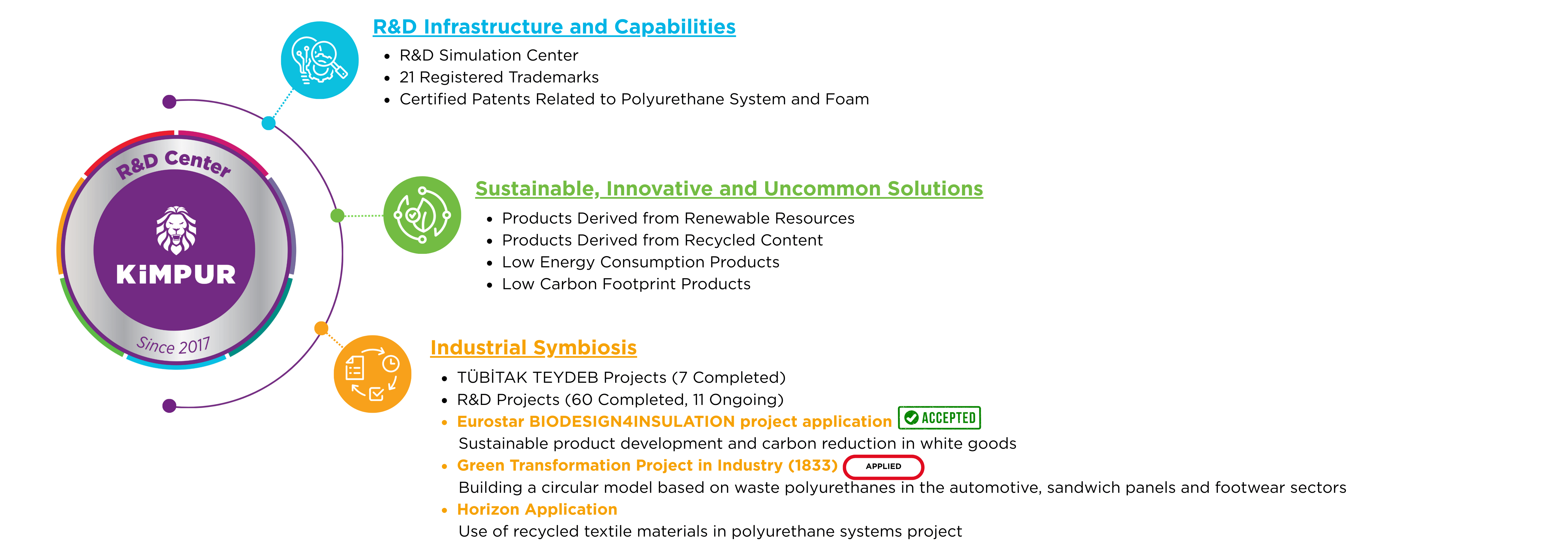 At Kimpur R&D Center, we develop innovative and high-performance solutions that touch every aspect of life. The systems we design provide sector-specific solutions across a wide range of industries, from footwear to white goods, and from automotive to insulation. Some of these systems are customized to meet customer-specific requirements and are also designed to meet sustainability criteria that aim to reduce environmental impact.