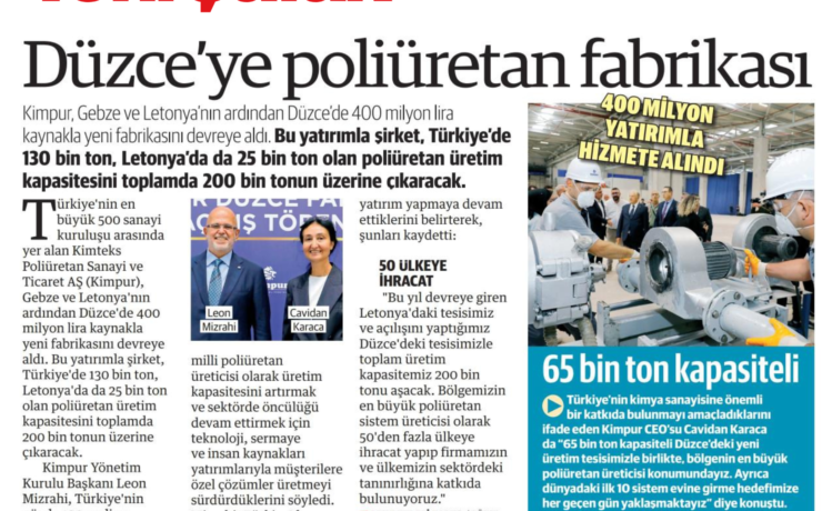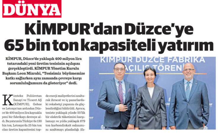 Kimpur, kaynakların verimli kullanımına yönelik üretim yaklaşımında önemli bir adım daha atarak yenilikçi bir geri dönüşüm sürecini hayata geçirdi. Şirket, Düzce üretim tesisinde, tüketici sonrası PET (polietilen tereftalat) şişe atıklarını kimyasal olarak geri dönüştürerek geri dönüştürülmüş içerikli polyester poliol üretimine başladı. Bu süreçte kullanılan depolimerizasyon