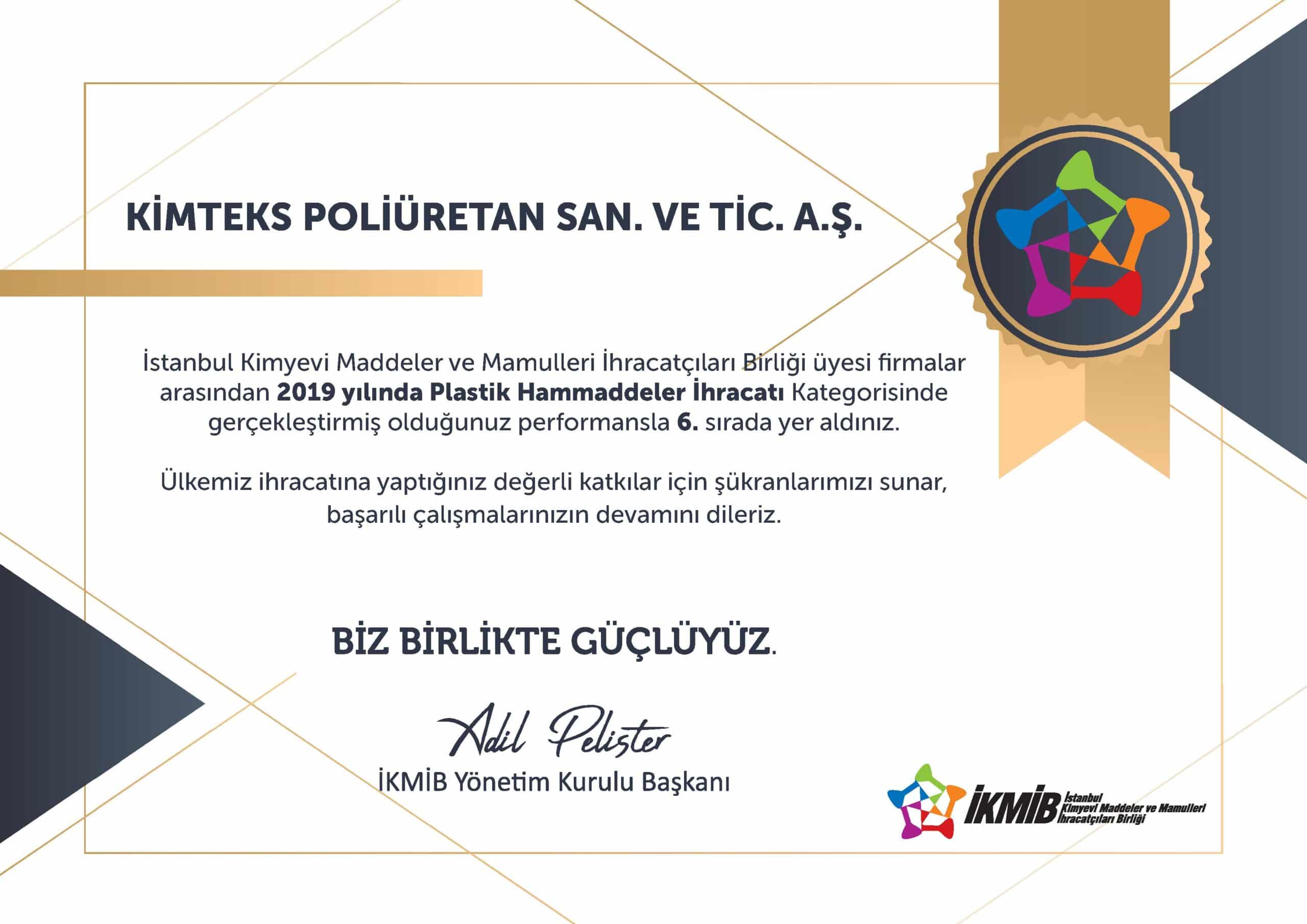İstanbul Kimyevi Maddeler ve Mamulleri İhracatçıları Birliği üyesi firmalar arasından 2019 yılında Plastik Hammaddeler İhracatı Kategorisi’nde 6.sırada yer aldık.