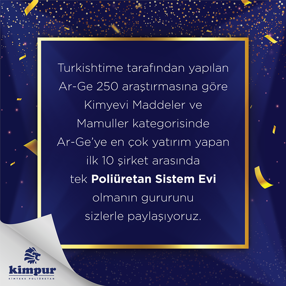 Turkishtime tarafından yapılan Ar-Ge 250 araştırmasına göre Kimyevi Maddeler ve Mamuller kategorisinde Ar-Ge’ye en çok yatırım yapan ilk 10 şirket arasında tek Poliüretan Sistem Evi olmanın gururunu sizlerle paylaşıyoruz.