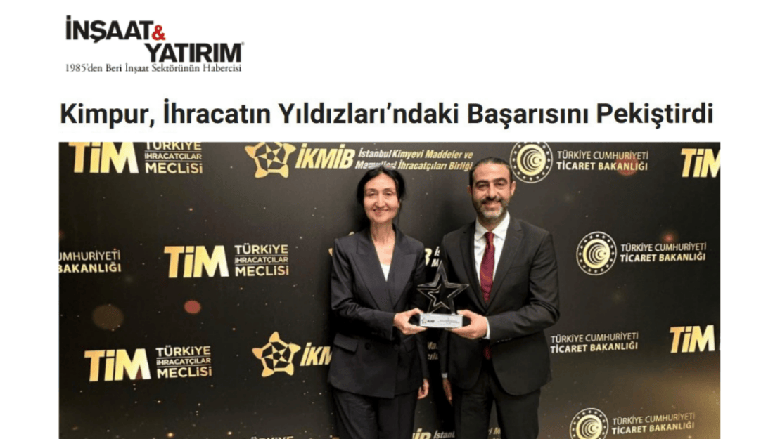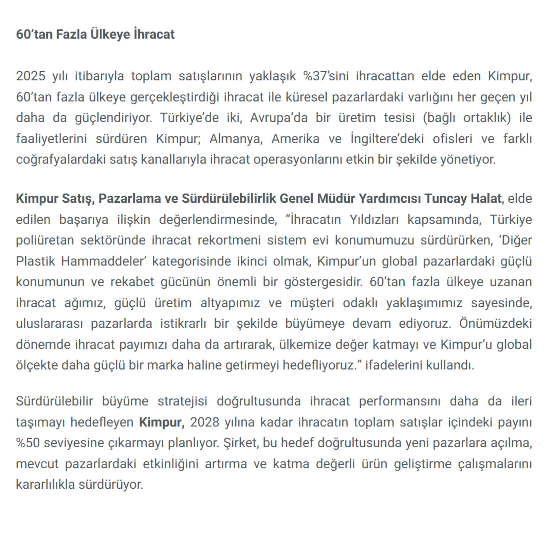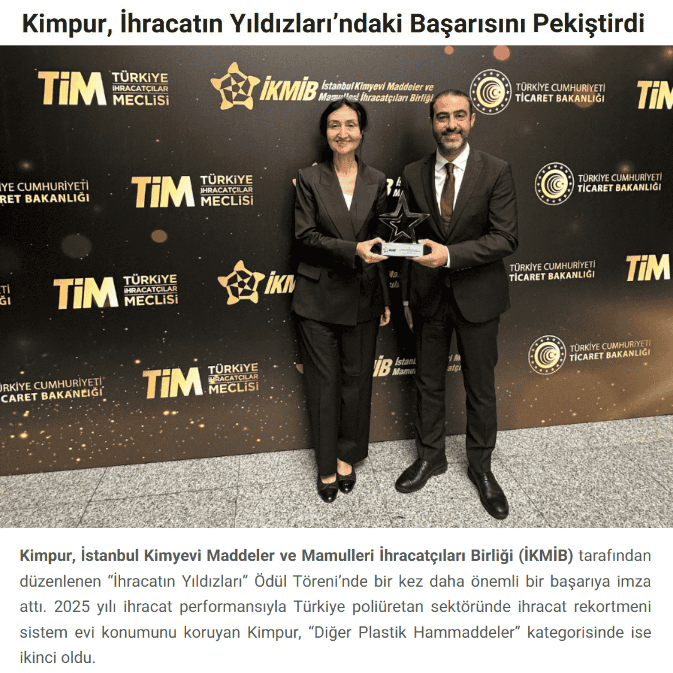 Kimpur, İhracatın Yıldızları’ndaki Başarısını Pekiştirdi Tarih: Nisan 6, 2026 Kategori: Basın Bültenleri Ana Sayfa › Blog › Kimpur, İhracatın Yıldızları’ndaki Başarısını Pekiştirdi1 dk okuma süresi İlgili İçerikler Kimpur, ANZ Bölgesindeki Faaliyetlerini Güçlendiriyor – Yatırımlar Dergisi Basın Bültenleri Kimpur, LSEG ESG Değerlendirmesinde Global Kimya Sektöründe 13. Sırada – SONDETAY Basın Bültenleri Kimpur Dijital Dönüşümünü SAP S/4HANA İle Güçlendirdi – SONDETAY Basın Bültenleri Kimpur, Aralık Ayında Satış Rekoru Kırdı – Turkchem Basın Bültenleri Sürdürülebilir Yapılar İçin İş Birliği – Analiz Basın Bültenleri Kimpur, 2024 Entegre Raporunu Yayınladı – SonDetay Basın Bültenleri Kimpur, Global Pazarın Dev Üreticisi – Dünya Basın Bültenleri