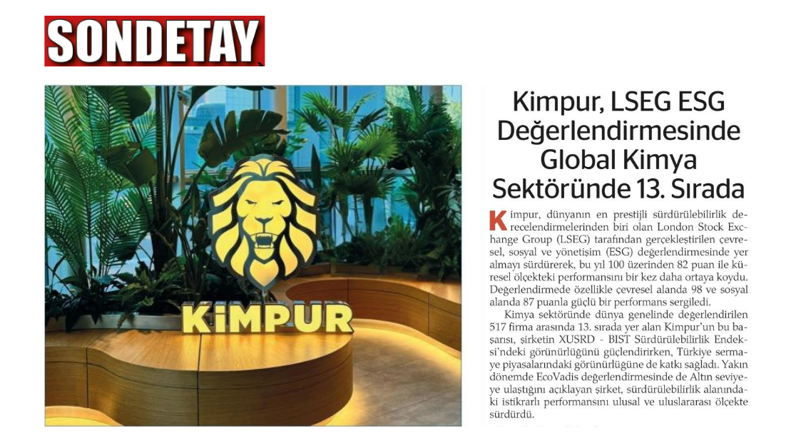 Kimpur, LSEG ESG Değerlendirmesinde Global Kimya Sektöründe 13. Sırada – SONDETAY