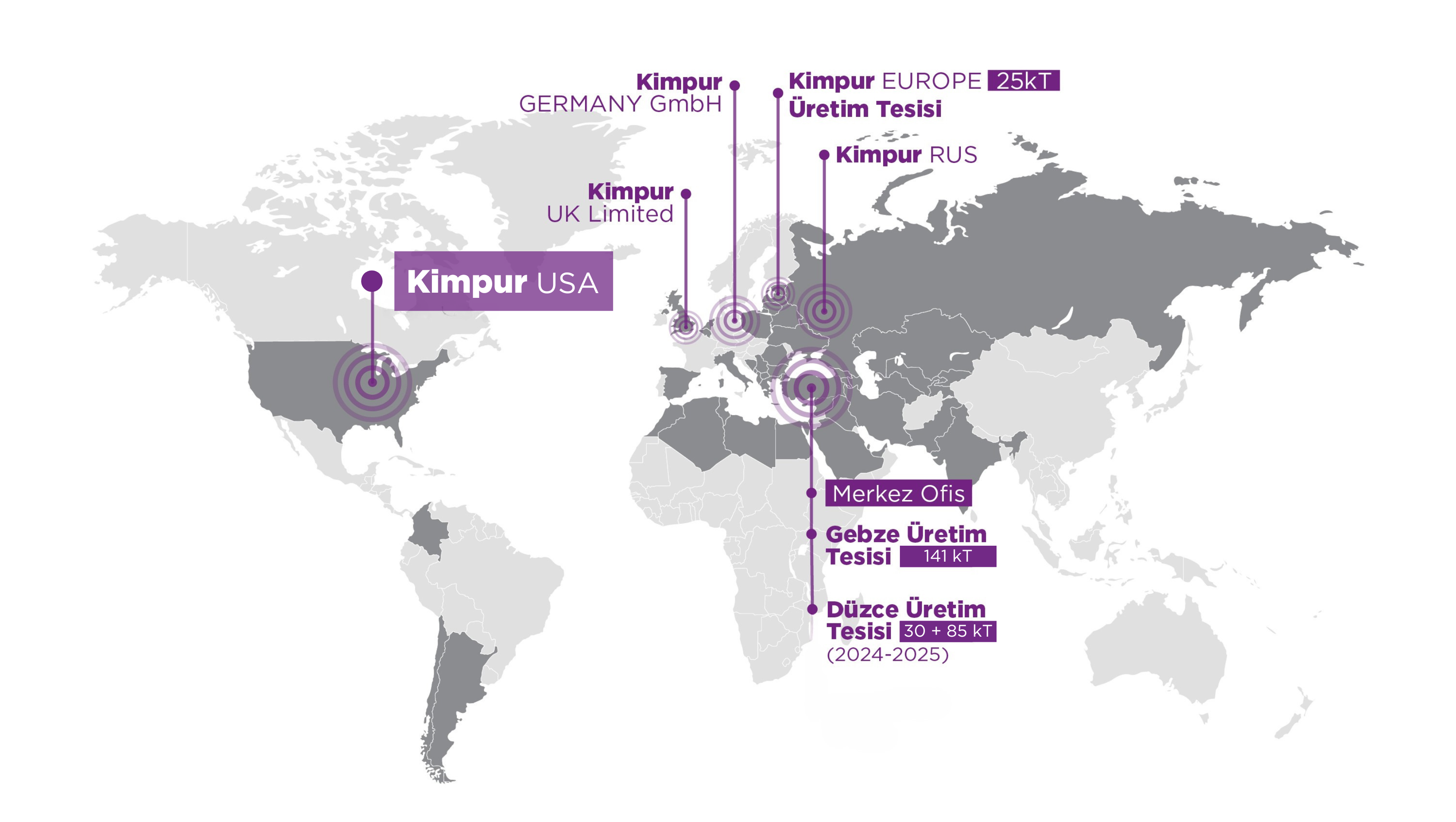 Kimpur, global büyüme stratejisi kapsamında Amerika pazarındaki varlığını güçlendirmek amacıyla Kimpur USA şirketini kurmuştur. Bu stratejik adım, Kimpur’un Amerika kıtasında ve çevre bölgelerdeki etkinliğini artırırken, yerel pazarda daha hızlı ve esnek çözümler sunmasına olanak tanımaktadır. Kimpur USA, pazar geliştirme faaliyetlerini yöneterek yeni iş birlikleri oluşturmayı, satış ve dağıtım süreçlerini optimize ederek operasyonel verimliliği artırmayı ve bölgedeki müşteri taleplerine daha hızlı yanıt vermeyi hedeflemektedir.