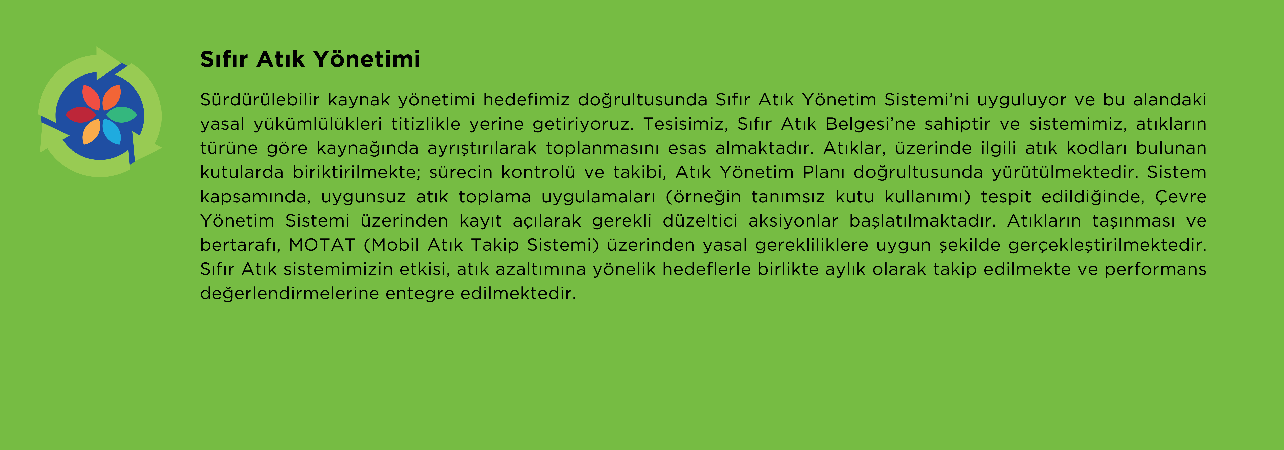 Tesislerimizde oluşan atıklarımıza ilişkin belirlenen yasal şartlara göre depolama, taşıma, bertaraf ve geri dönüşüm süreçlerini uyguluyoruz. Fabrikamızda kurduğumuz Sıfır Atık Sistemi ile atıkları, türüne göre kaynağında ayrı olarak biriktiriyor, geri kazanımını sağlıyoruz.