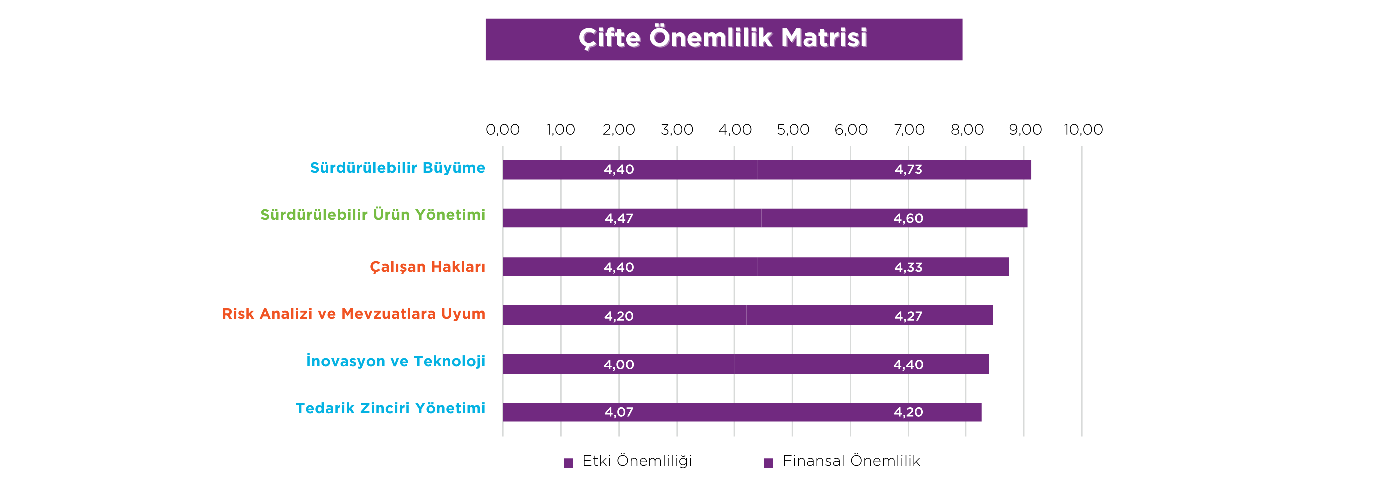 Sürdürülebilirlik stratejimizin merkezinde yer alan öncelikli konularımız, hem çevresel hem de toplumsal sorumluluklarımızı en üst düzeyde yerine getirmemizi sağlar.