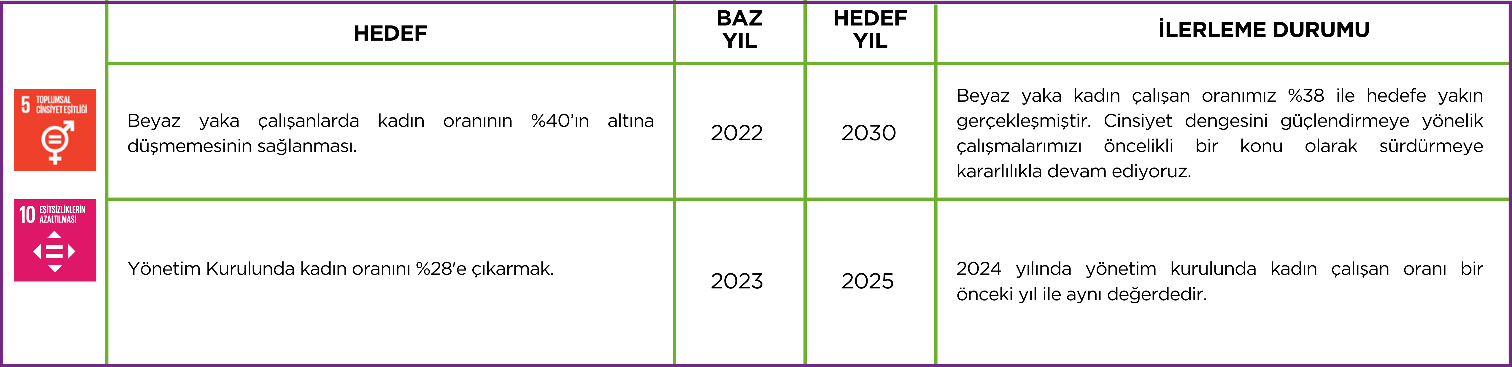 Beyaz yakada gücünün yaklaşık %39’unu kadınlardan alan bir firma olarak kadın bir CEO liderliğinde çalışmaktan gurur duyuyoruz. İşe alımdan emekliliğe kadar kadın ve erkeklere eşit haklar sağlayarak hem toplum içinde hem de profesyonel hayatta cinsiyet eşitliğini sağlamayı hedefliyoruz. Cinsiyet eşitliğini tüm çalışanlar arasında yaygınlaştırmak, farkındalığı artırmak, kadınları kariyerleri boyunca desteklemek, kadın istihdam oranını artırmak ve kadınların karar alma mekanizmalarındaki rolünü artırarak liderlikte cinsiyet eşitliğini sağlamak için ilerliyoruz.