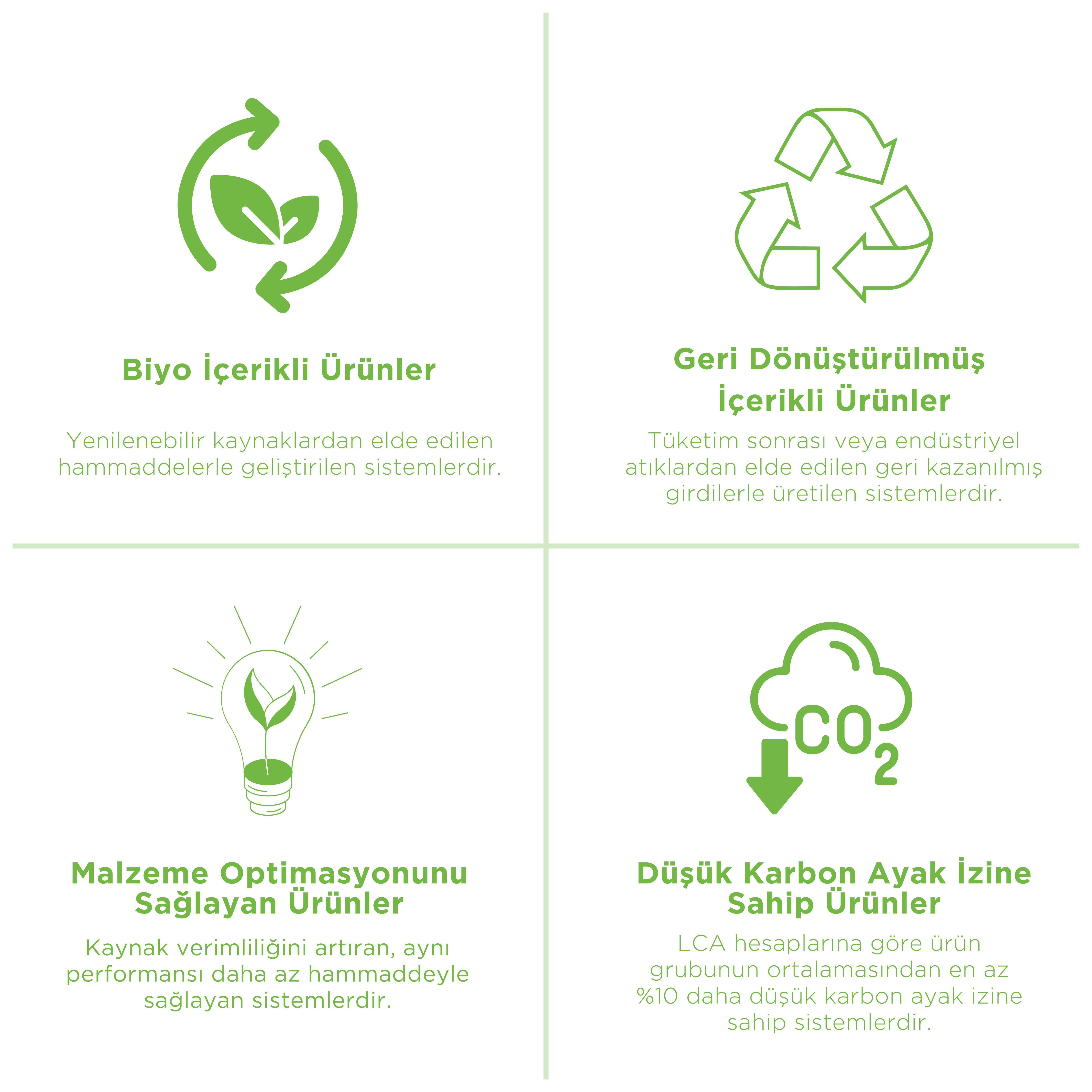 LCA sonuçları doğrultusunda, düşük karbon ayak izine sahip ürünlerimiz tanımlanmış ve bu ürünler için özel bir yönetim modeli geliştirilmiştir. Bu model sayesinde sürdürülebilir ürünler, satış stratejilerinde öne çıkarılmış; ürün geliştirme hedeflerine çevresel kriterler sistematik biçimde entegre edilmiştir. Aynı zamanda, müşteri sürdürülebilirlik denetimlerine veri temelli katkı sağlanarak şeffaf iletişim güçlendirilmiştir. Bu bütüncül yaklaşım, çevresel performansı yalnızca ölçülen bir gösterge olmaktan çıkarıp stratejik bir avantaj haline getirmekte; müşterilerimizin sürdürülebilirlik hedeflerine ulaşma yolunda doğrudan değer sunmasına olanak tanımaktadır.